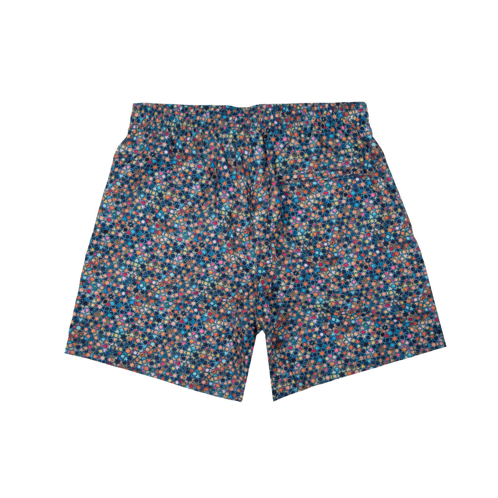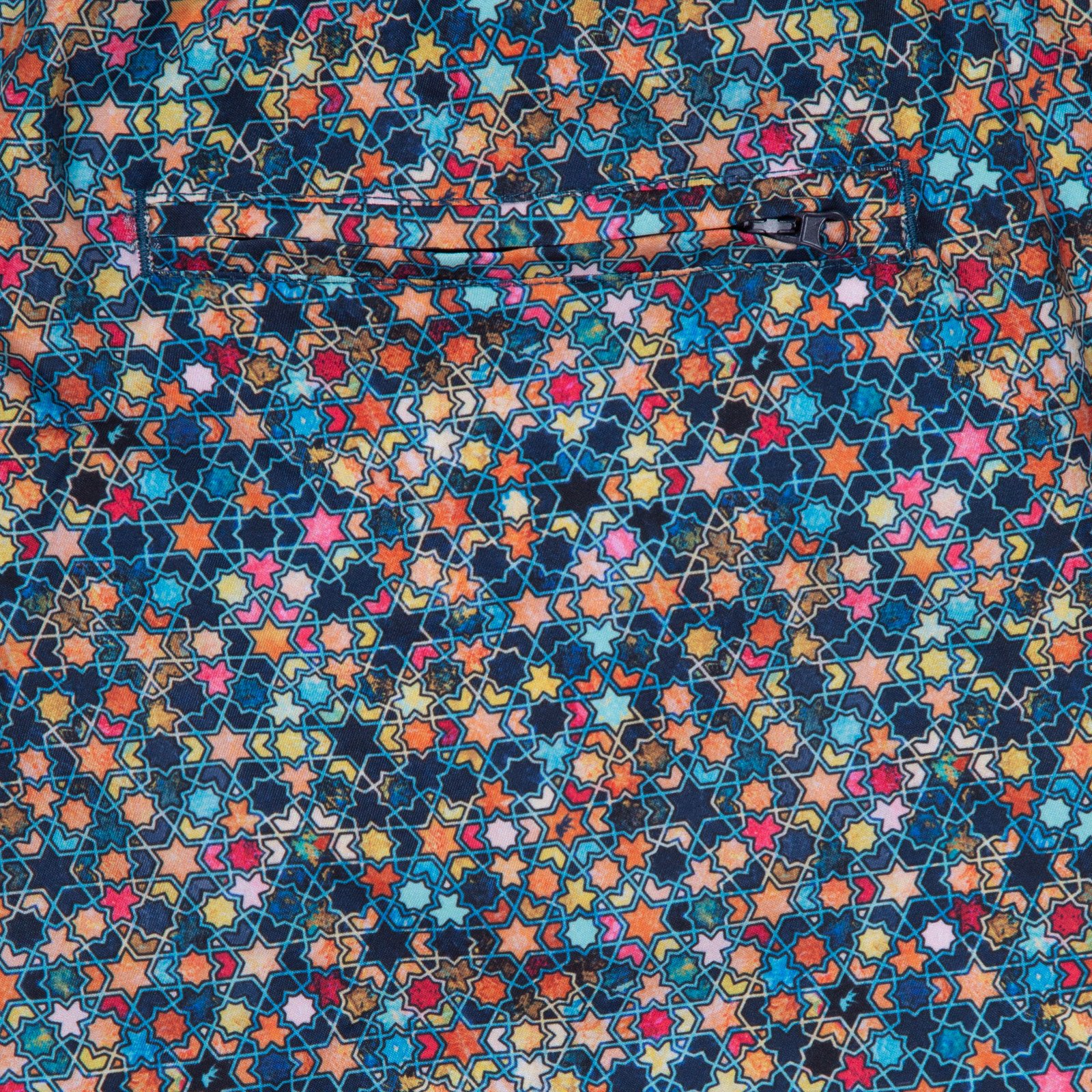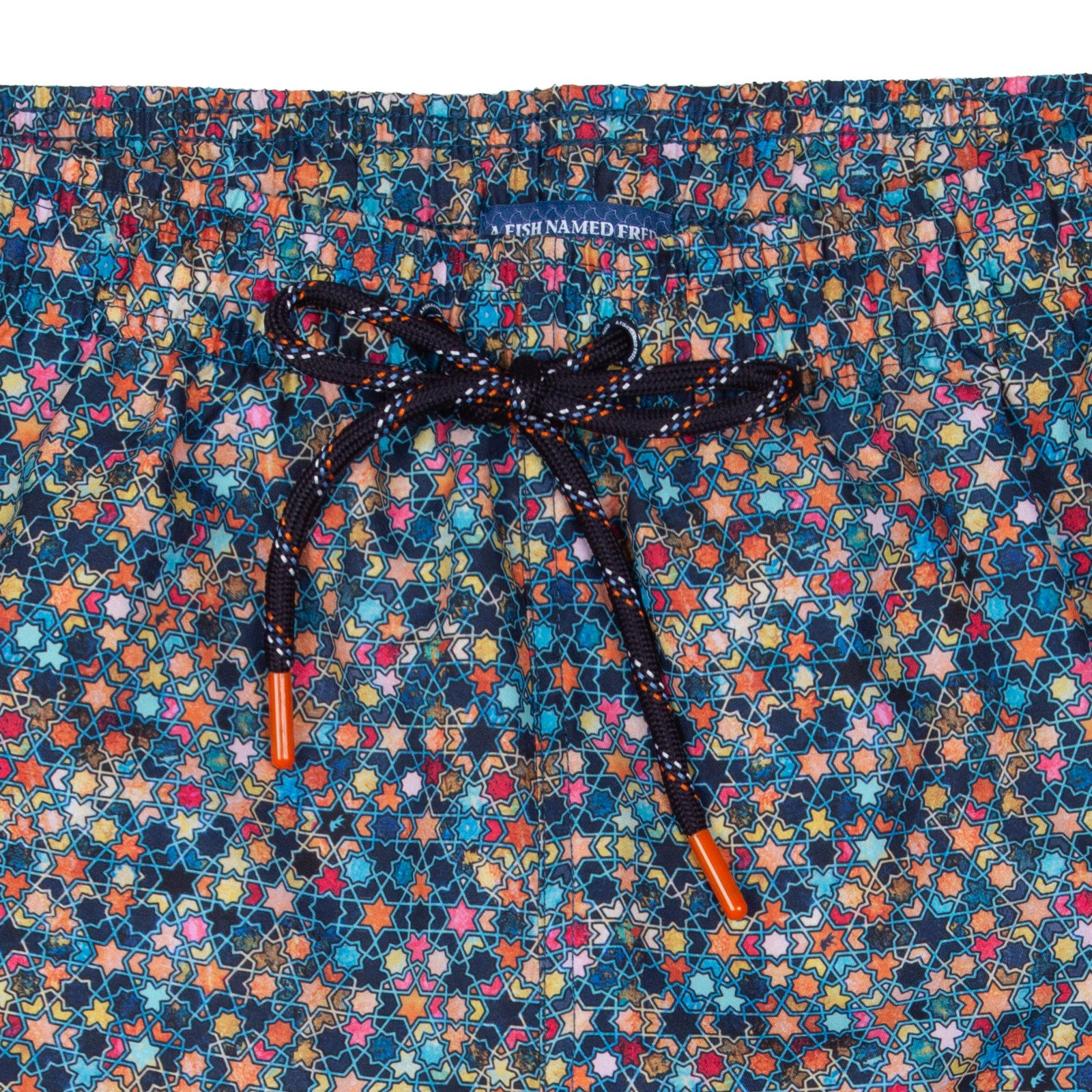Regular fit swim shorts, crafted from a quick-dry polyester and featuring an all-over "Star Tiles" print. Net lining. Zip-up rear pocket with net lining. Two angled side pockets with net lining. Elasticated waistband with drawstring.