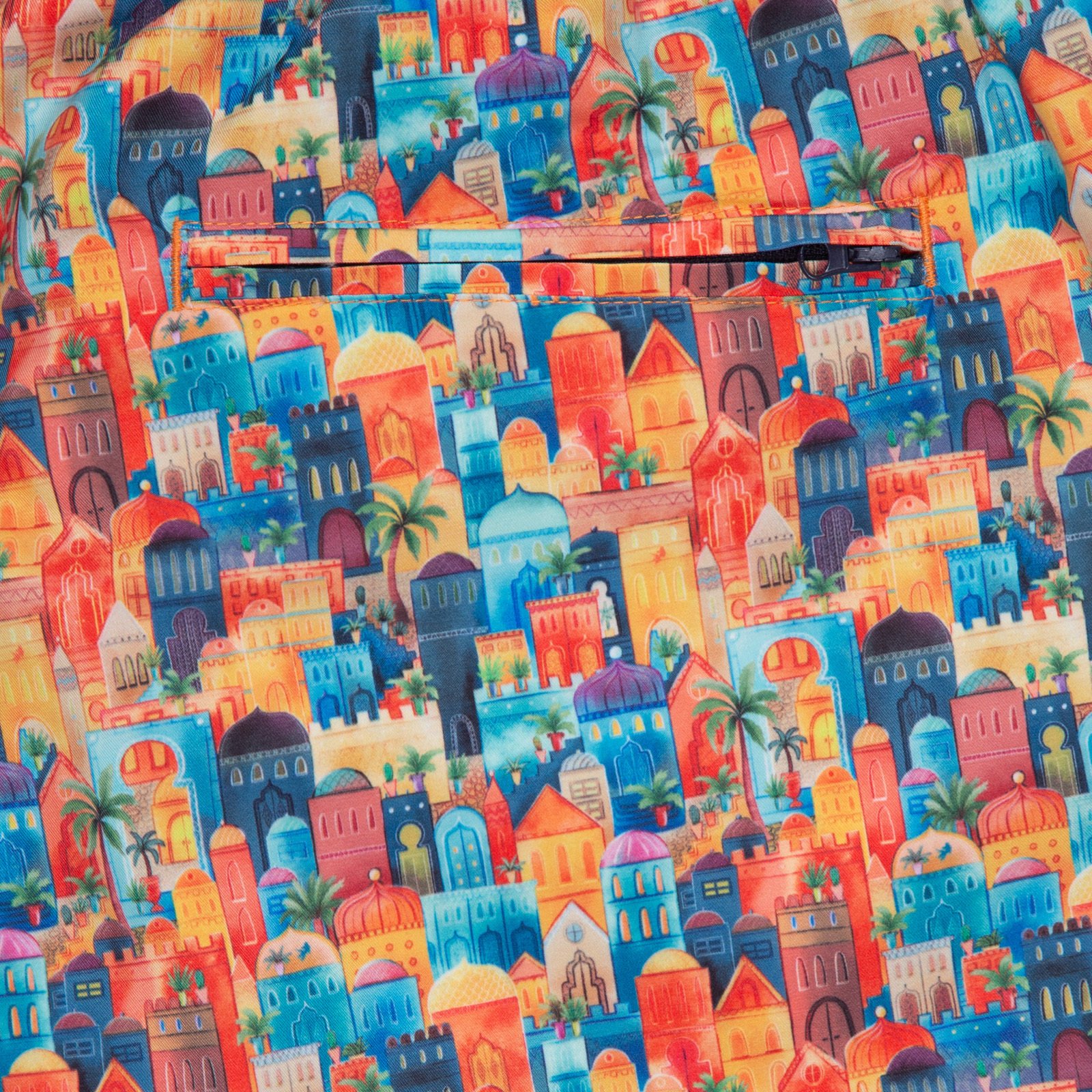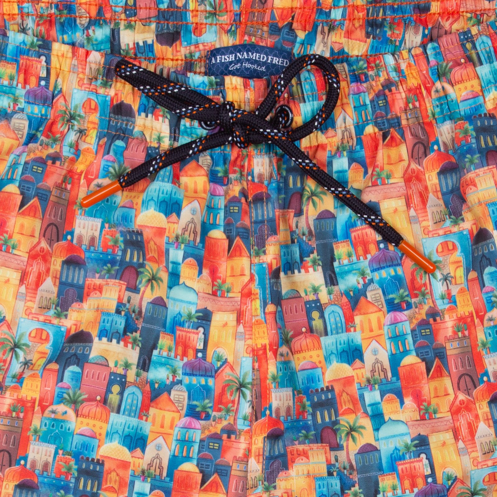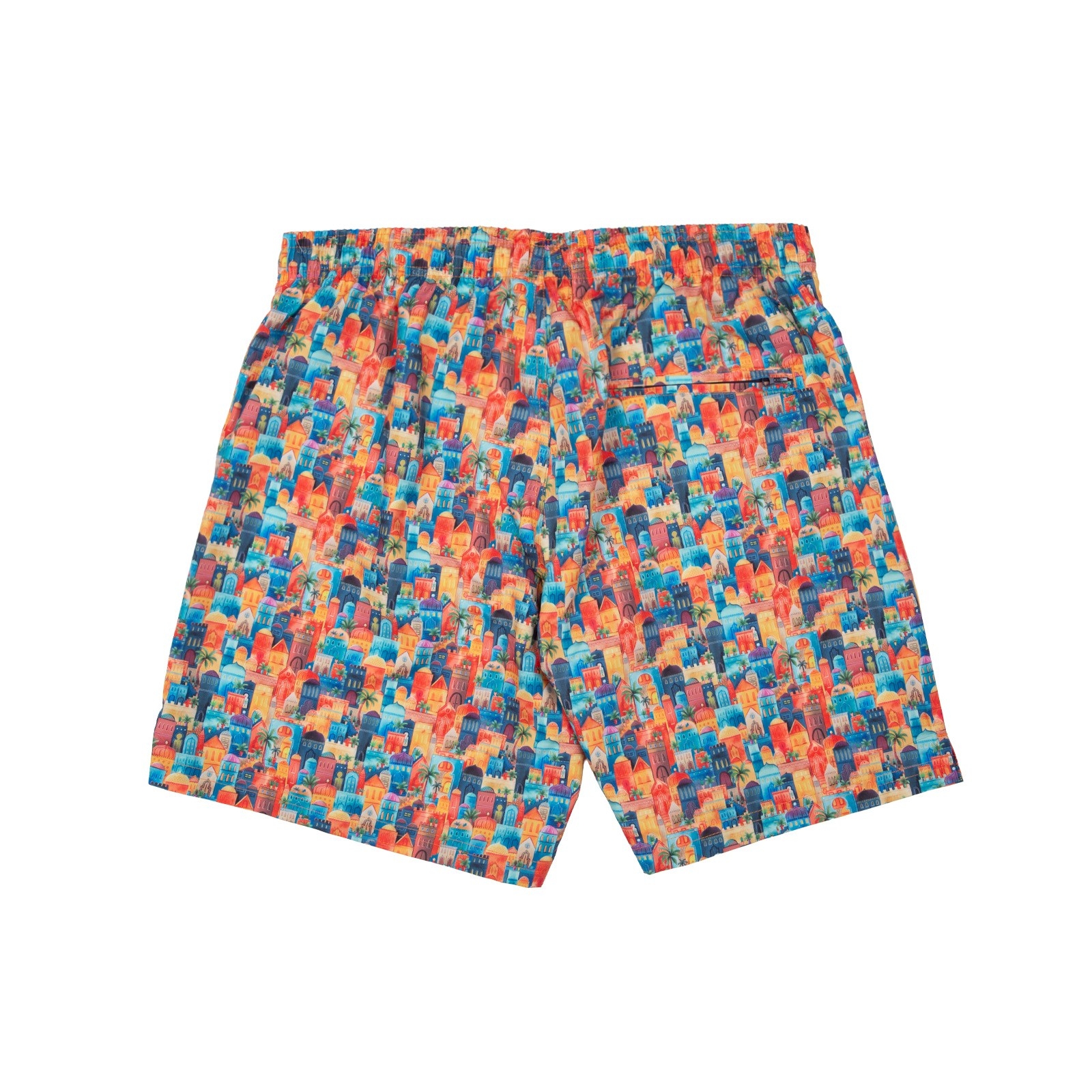 Regular fit swim shorts, crafted from a quick-dry polyester and featuring an all-over "Moroccan Town" print. Net lining. Zip-up rear pocket with net lining. Two angled side pockets with net lining. Elasticated waistband with drawstring.