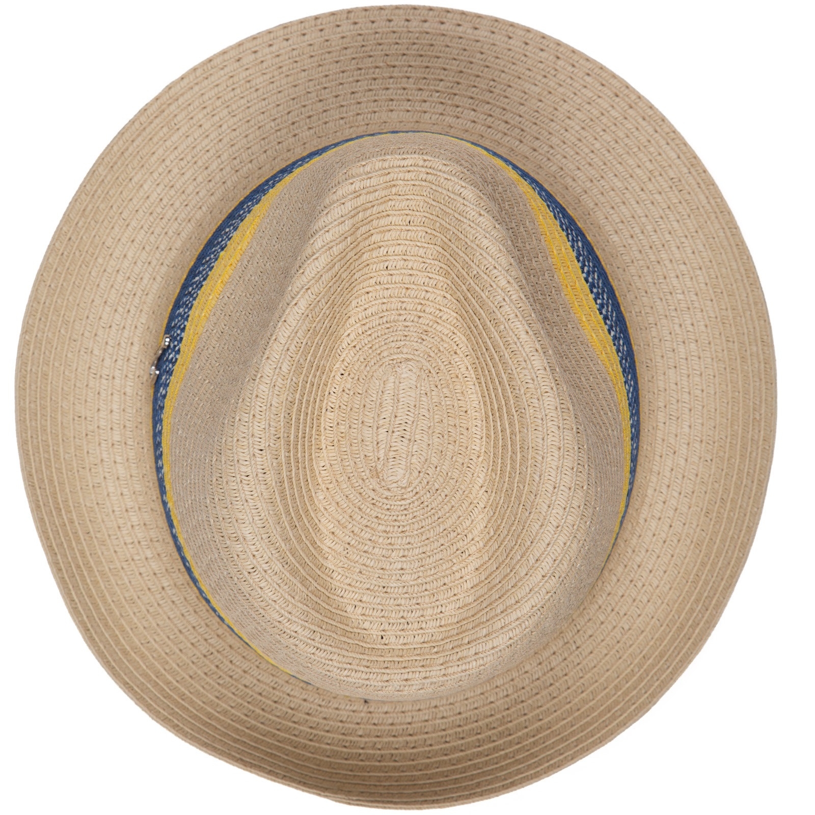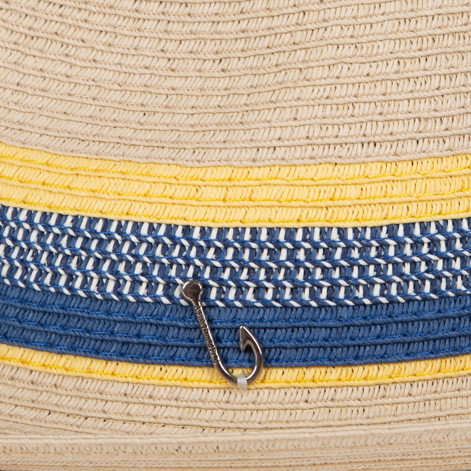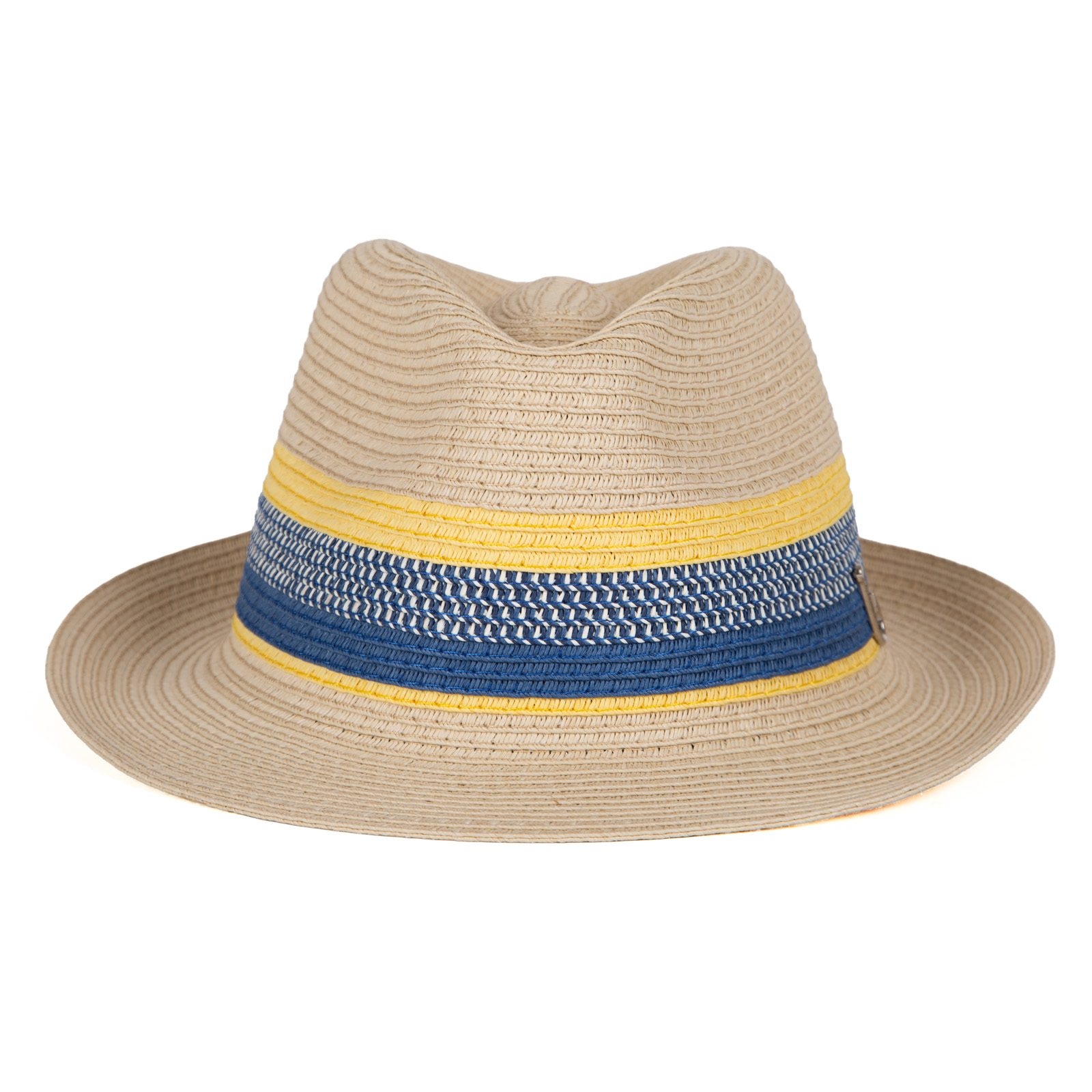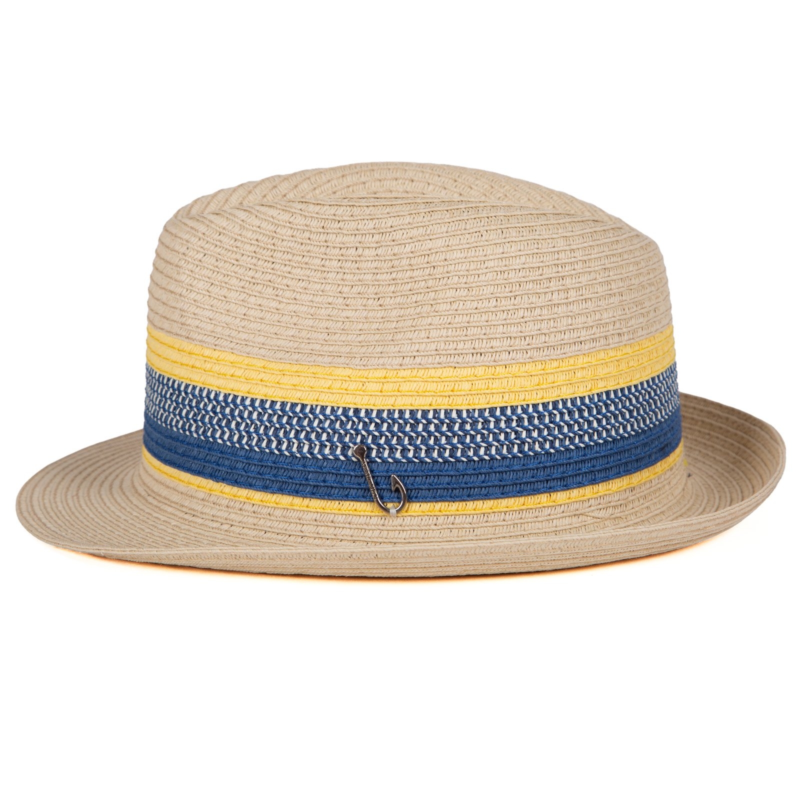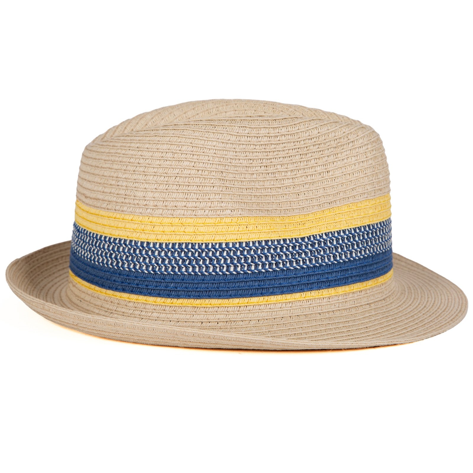 Light Summer trilby hat in a soft twisted paper yarn with a contrast blue and yellow panel.