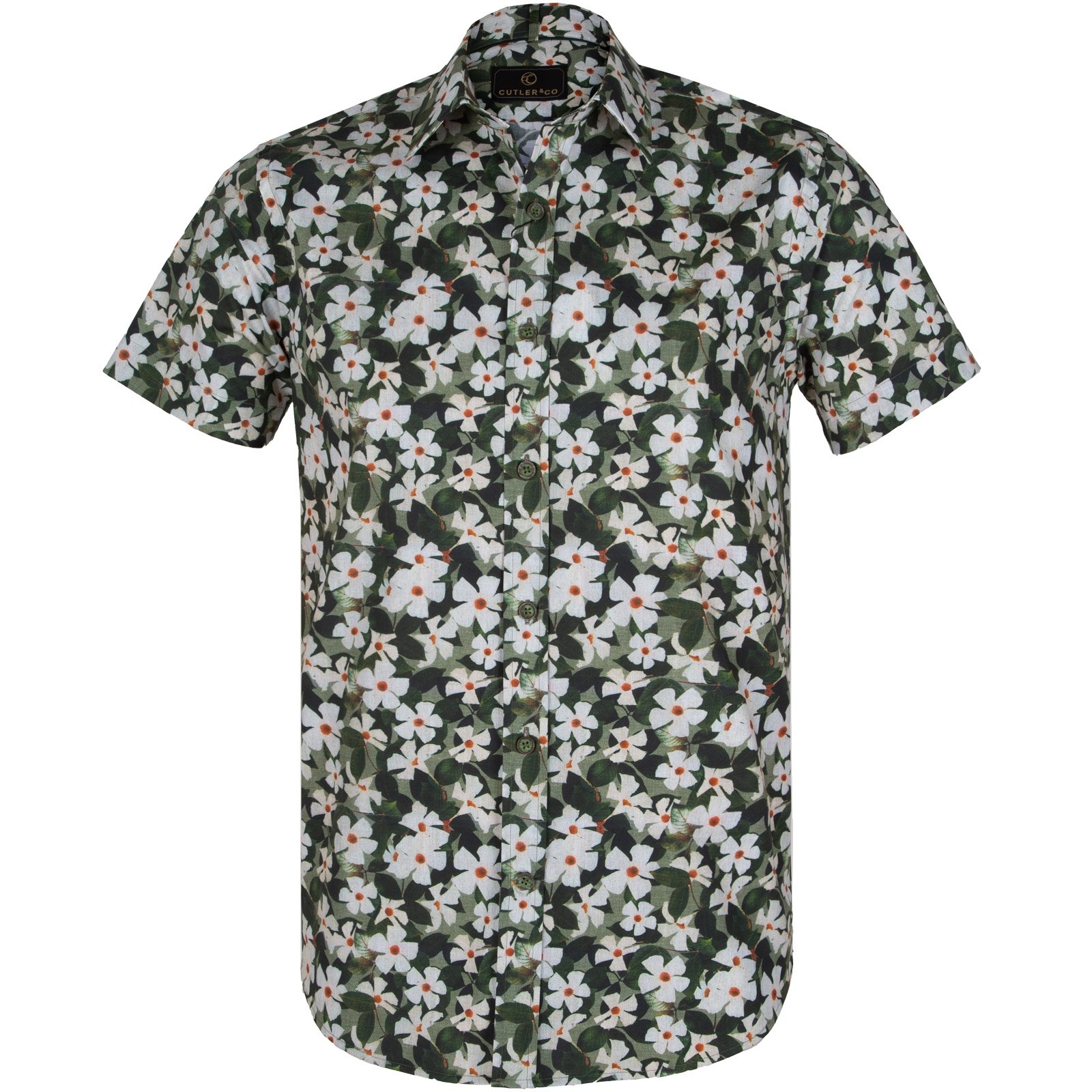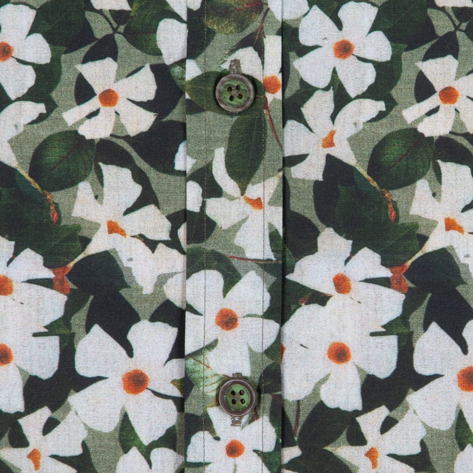 Soft casual short sleeve shirt with a Frangipani floral print in stretch cotton. Darts in the back for a tapered fit.