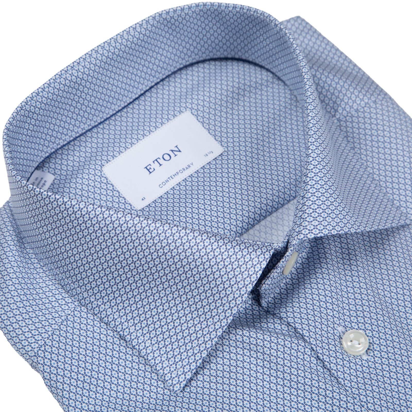 Contemporary fit dress shirt in a luxury cotton with a micro geometric print. Features darts in the back for a slim tapered fit. Double button cuffs with extra button hole for cufflinks. Modern spread collar with fixed bones.