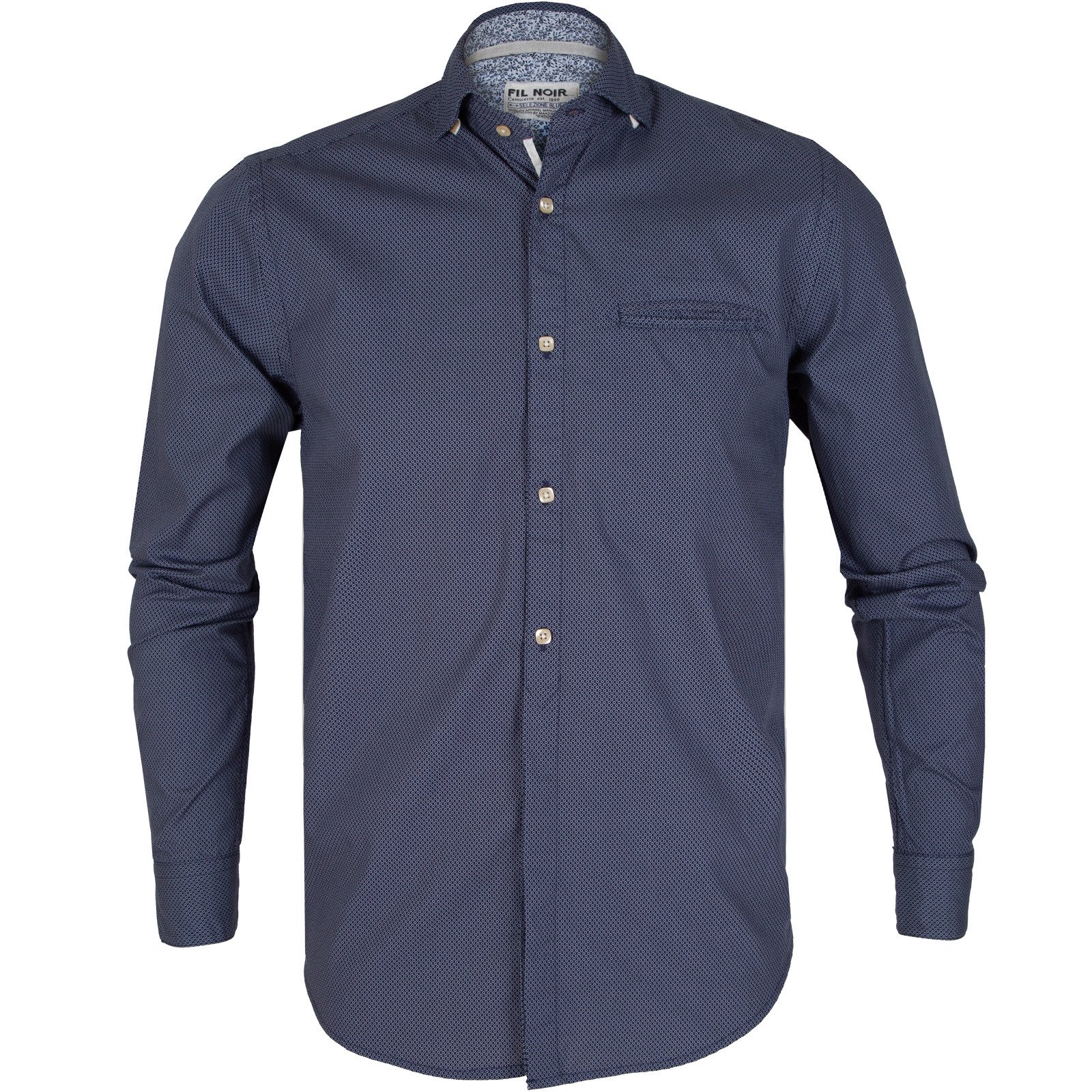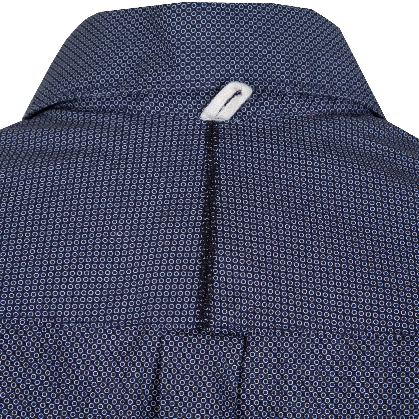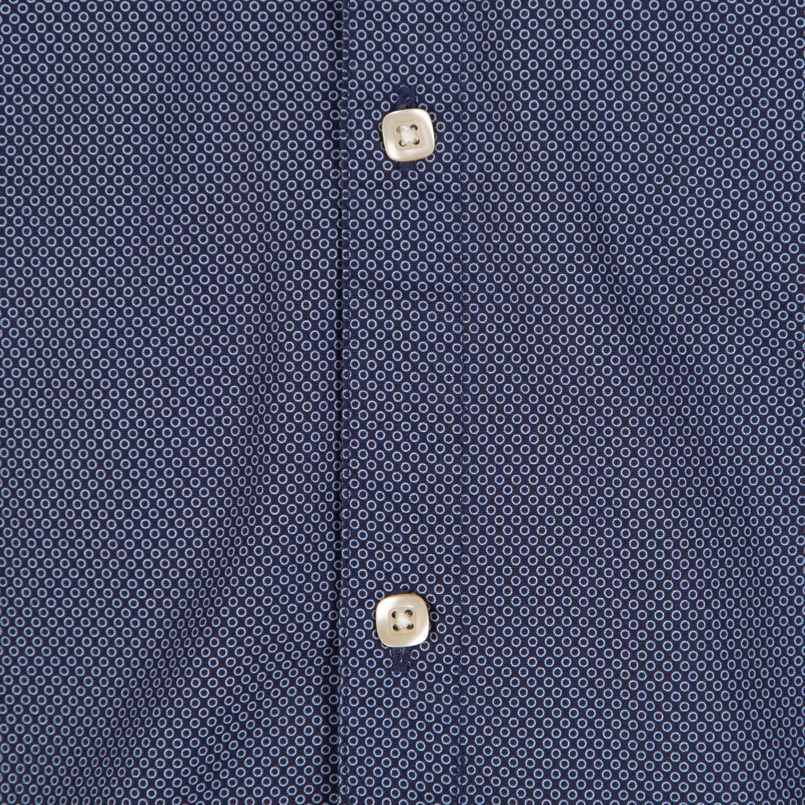 A tapered fit casual shirt in a soft cotton with a micro geometric print and subtle trim detail. Features darts in the back for a tapered fit, and soft fashion under-button down collar.