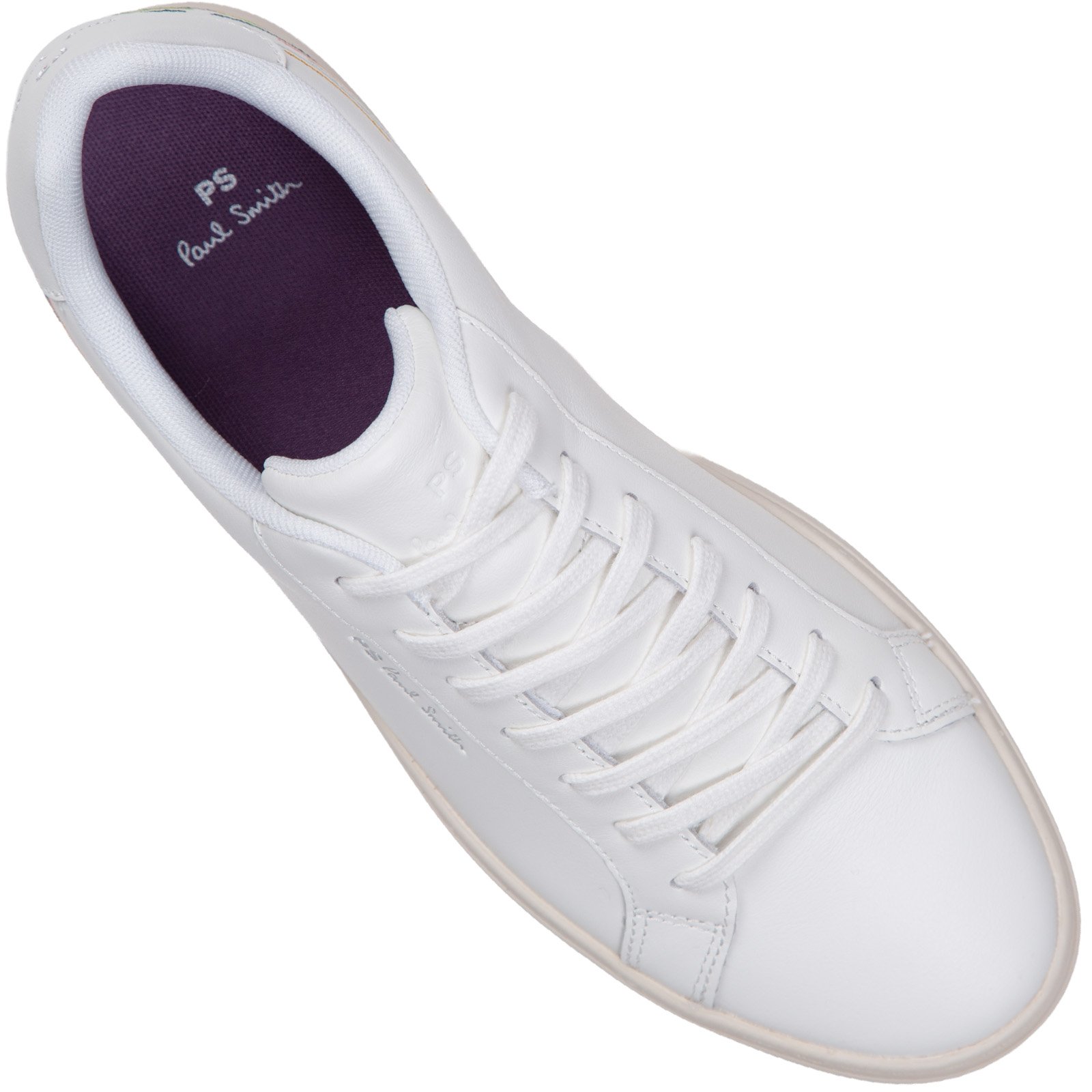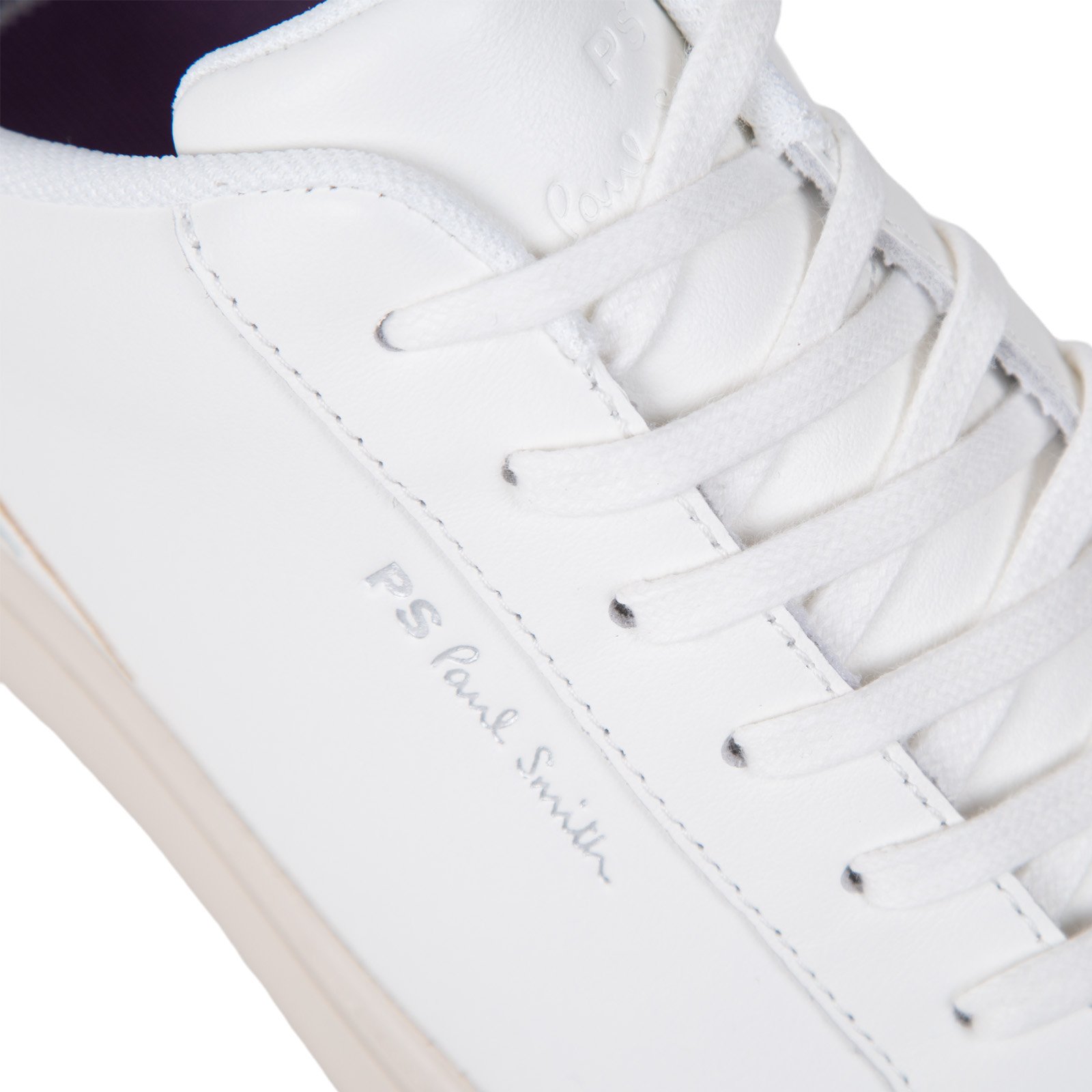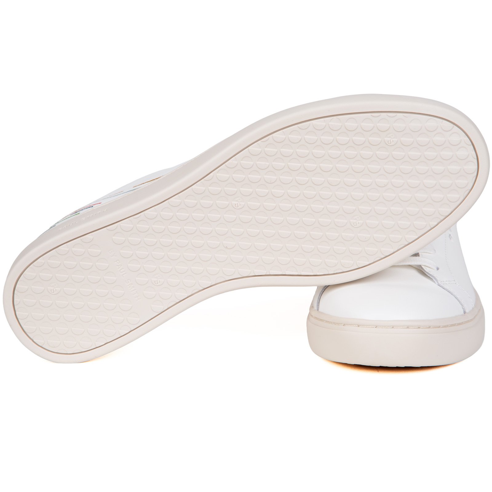 Crafted from premium leather, these white 'Rex' sneakers feature a multi-coloured embroidered detail at the heel - adding a pop of colour to this timeless style. Ideal for everyday wear, these classic sneakers are complete with beige rubber cupsoles with side-wall stitching. Finished with a Paul Smith signature logo on the side..