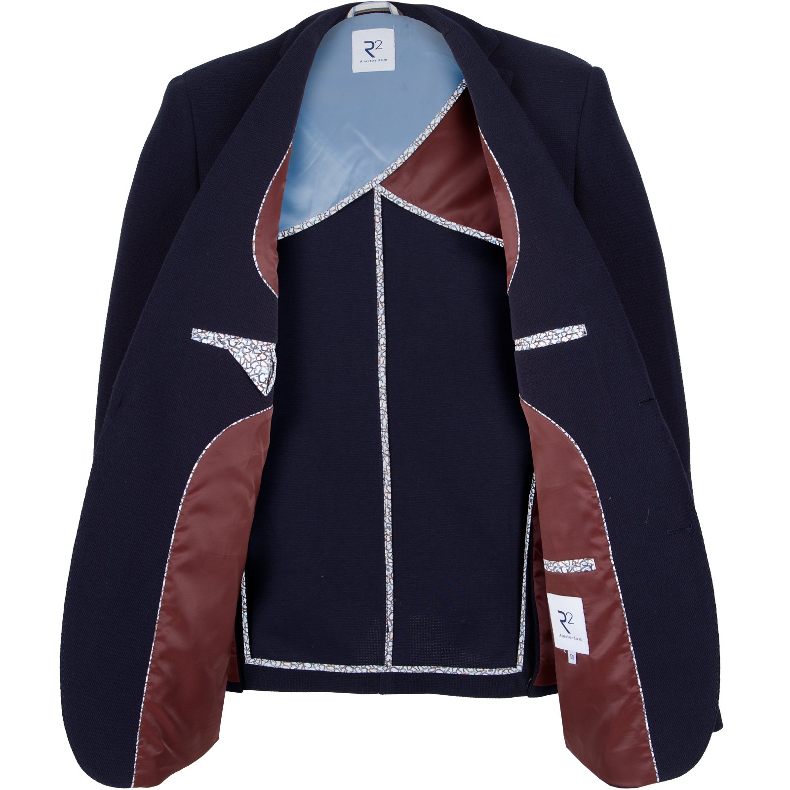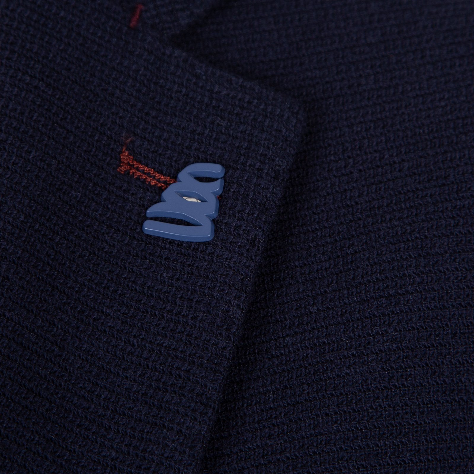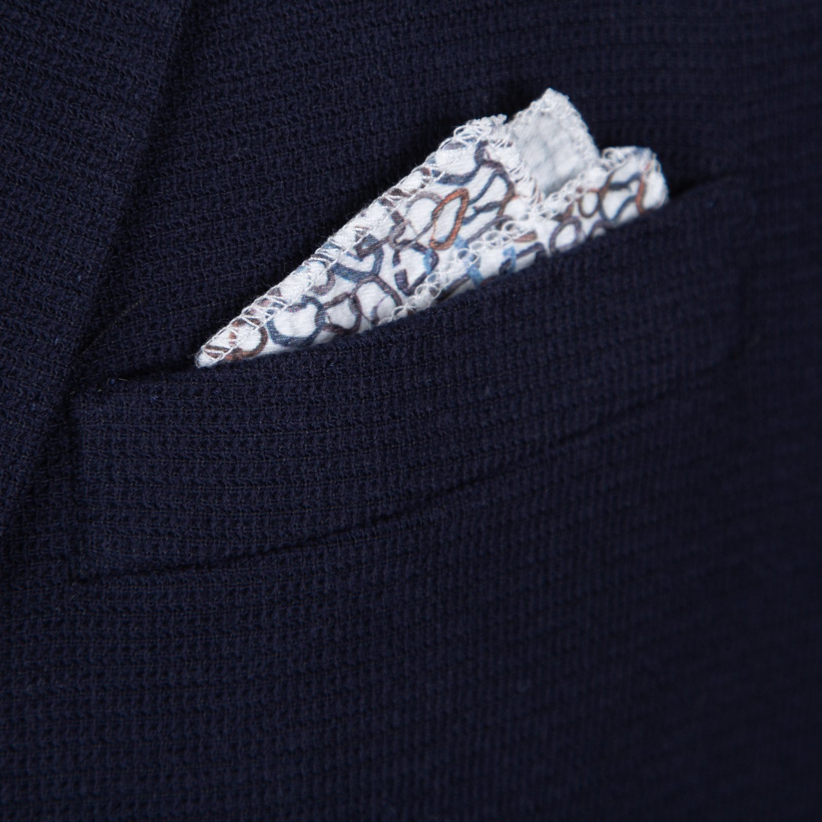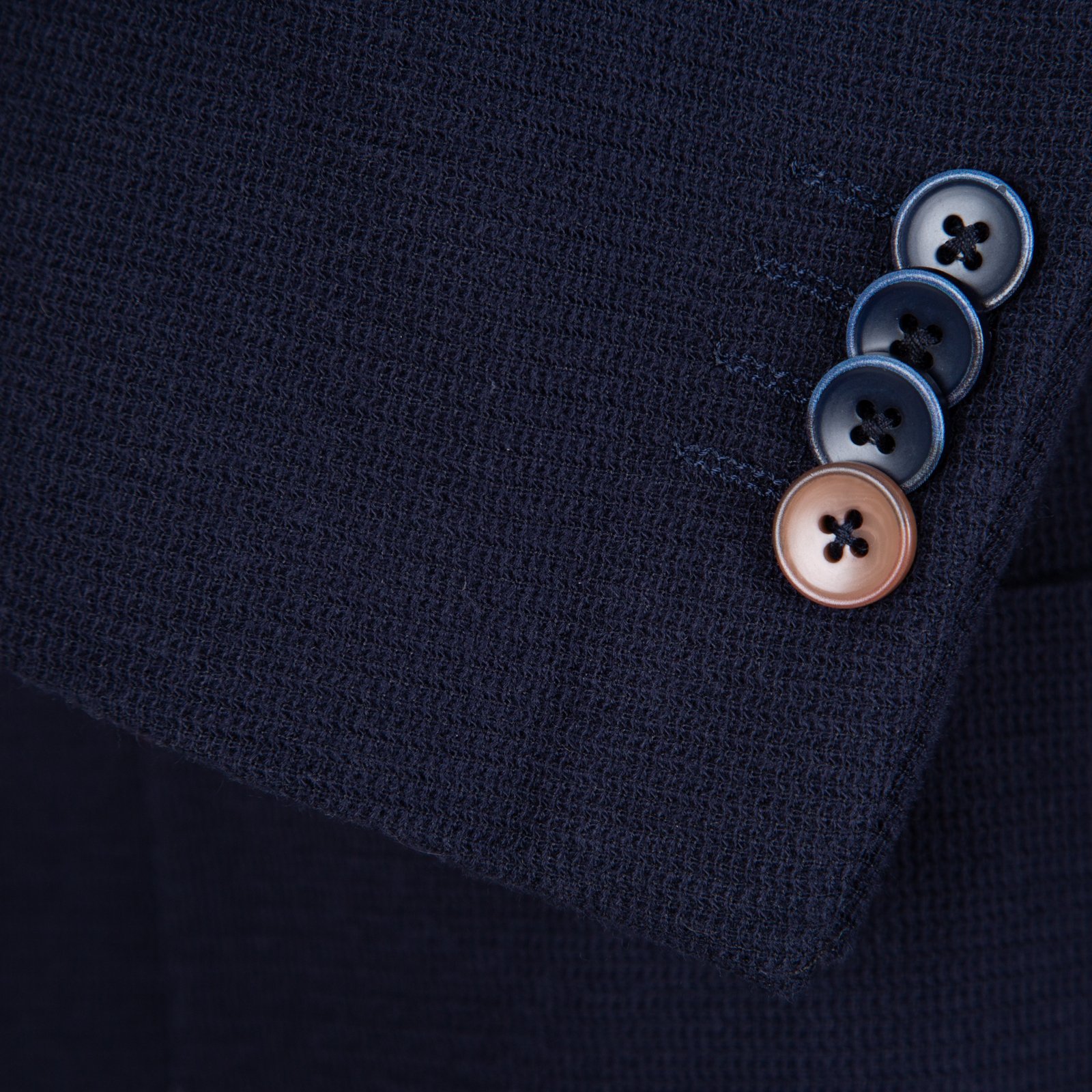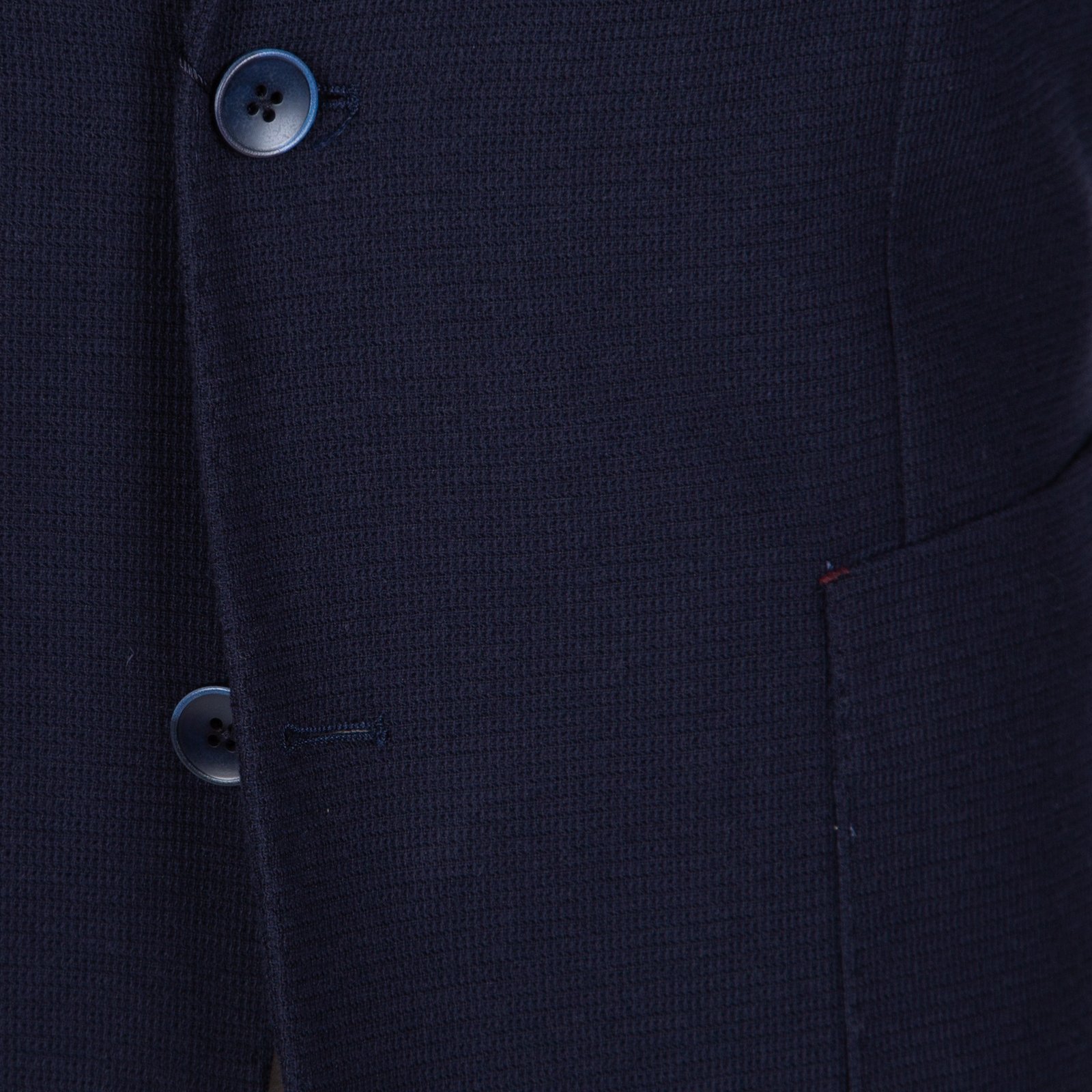 This navy mid-weight stretch knit blazer is a smart jacket that is so versatile, and comfortable to wear. Features contrast half lining, with internal pockets, a pocket square, and feature button detail.