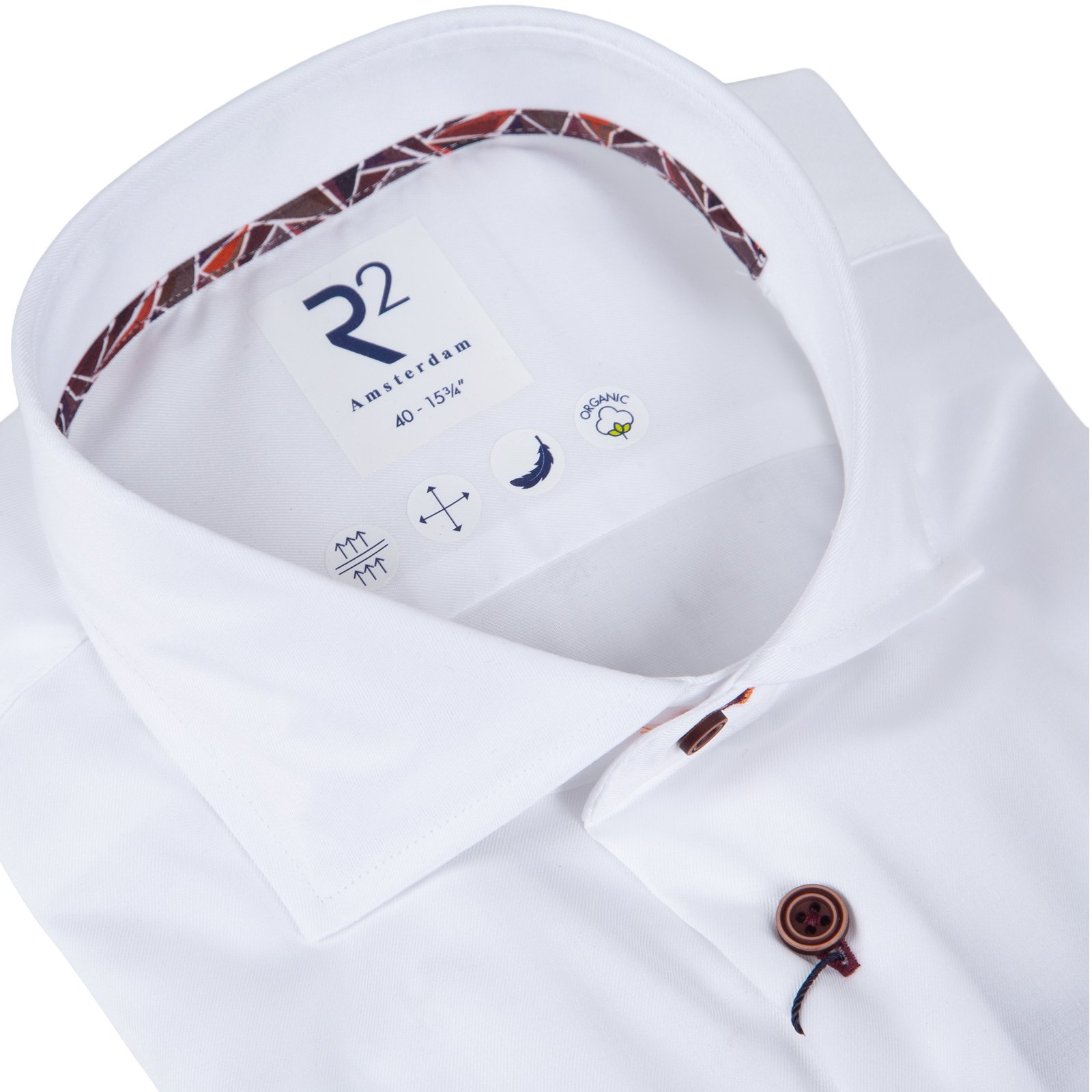 Luxury white 2-ply organic cotton twill dress shirt. Features darts in the back for a tapered fit. Modern spread collar. Double button cuffs with contrast buttons and print trim detail in collar and cuffs.