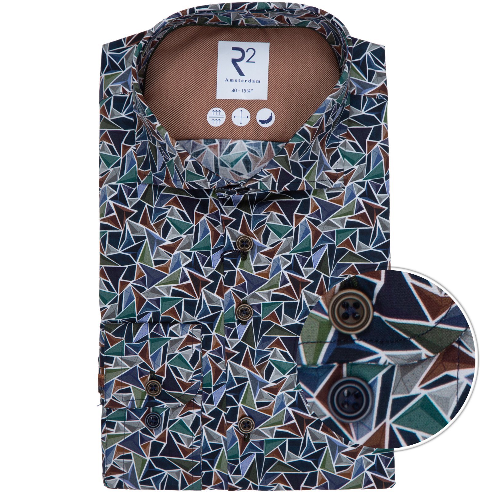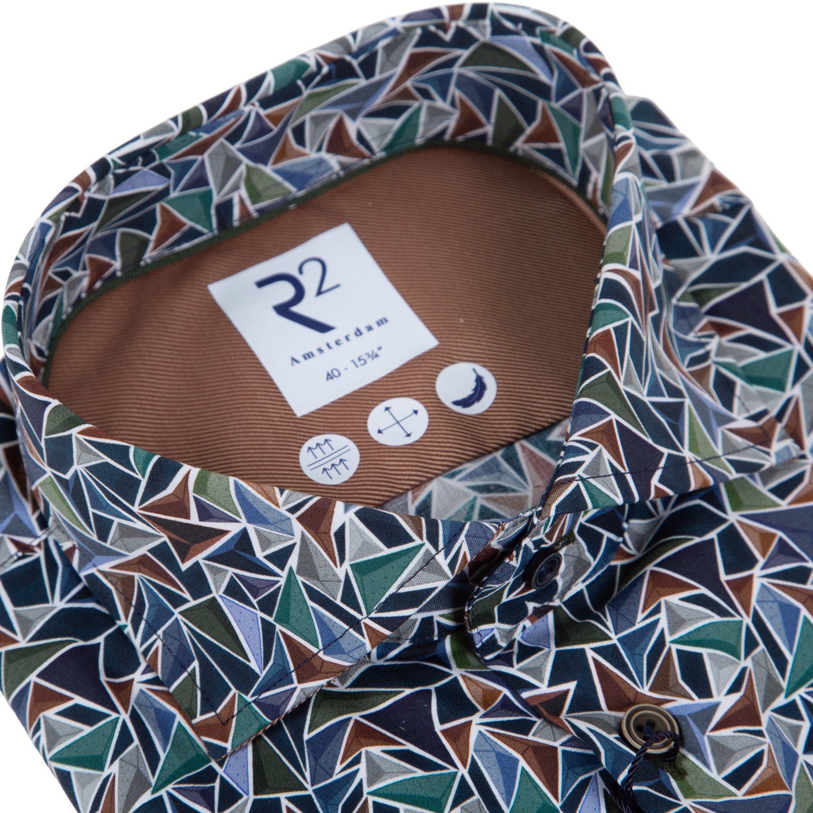 Luxury stretch cotton shirt in a fun prism print. Features darts in the back for a tapered fit. Modern spread collar. Double button cuffs with dark buttons.