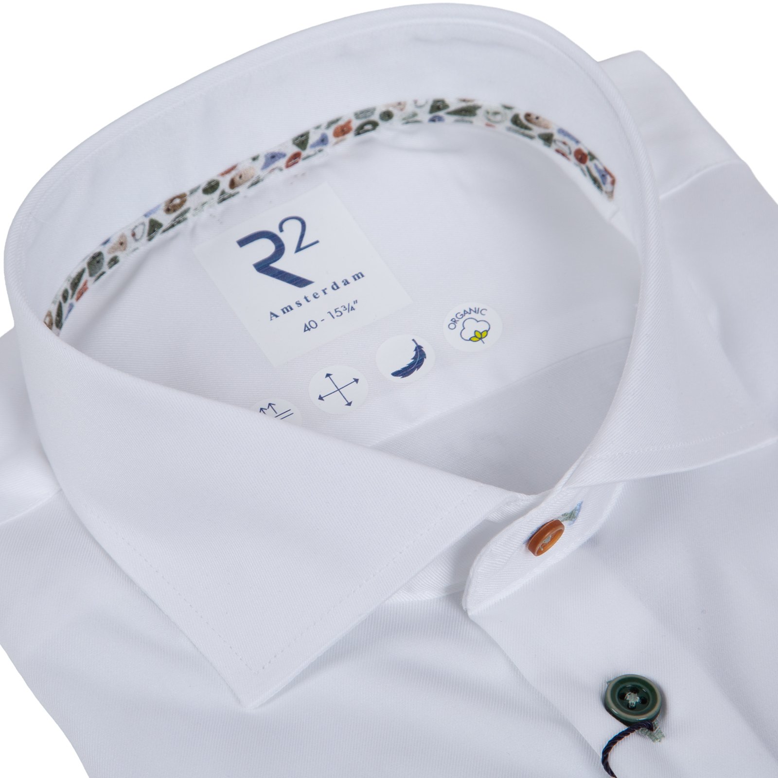 Luxury 2-ply organic cotton twill dress shirt. Features darts in the back for a tapered fit. Modern spread collar. Double button cuffs with contrast buttons and print trim detail in collar and cuffs.