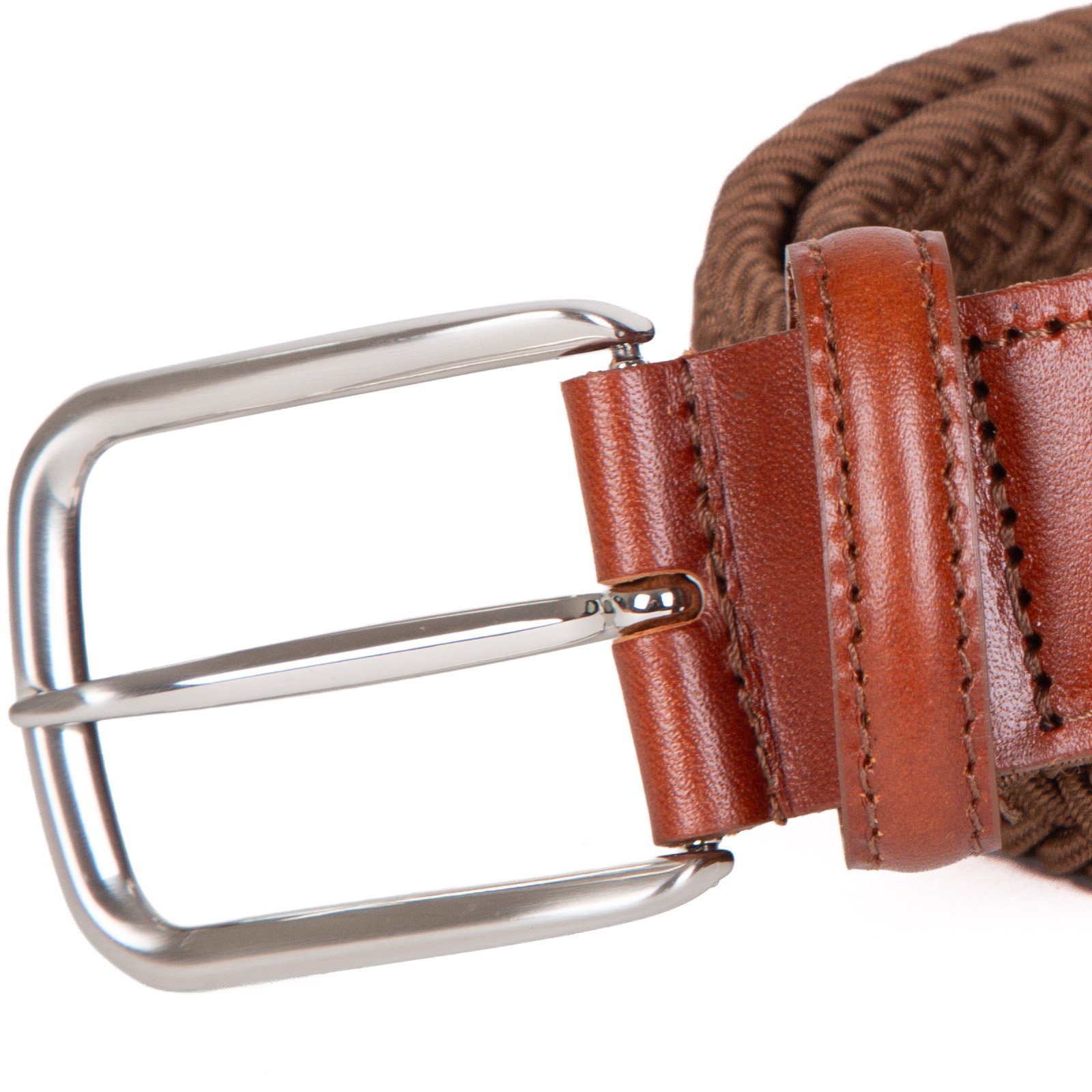 100% elastic with leather trim. 35mm wide, with solid brass buckles.